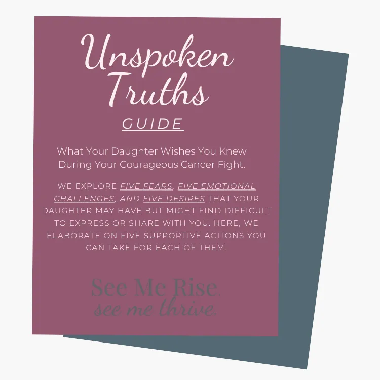 That’s why I created the Unspoken Truths Guide. It’s designed to help you navigate your cancer journey with love and understanding. Inside, you’ll discover your daughter’s unspoken fears, emotional challenges, and heartfelt desires, along with simple ways to open up meaningful conversations that strengthen your bond without adding more stress.